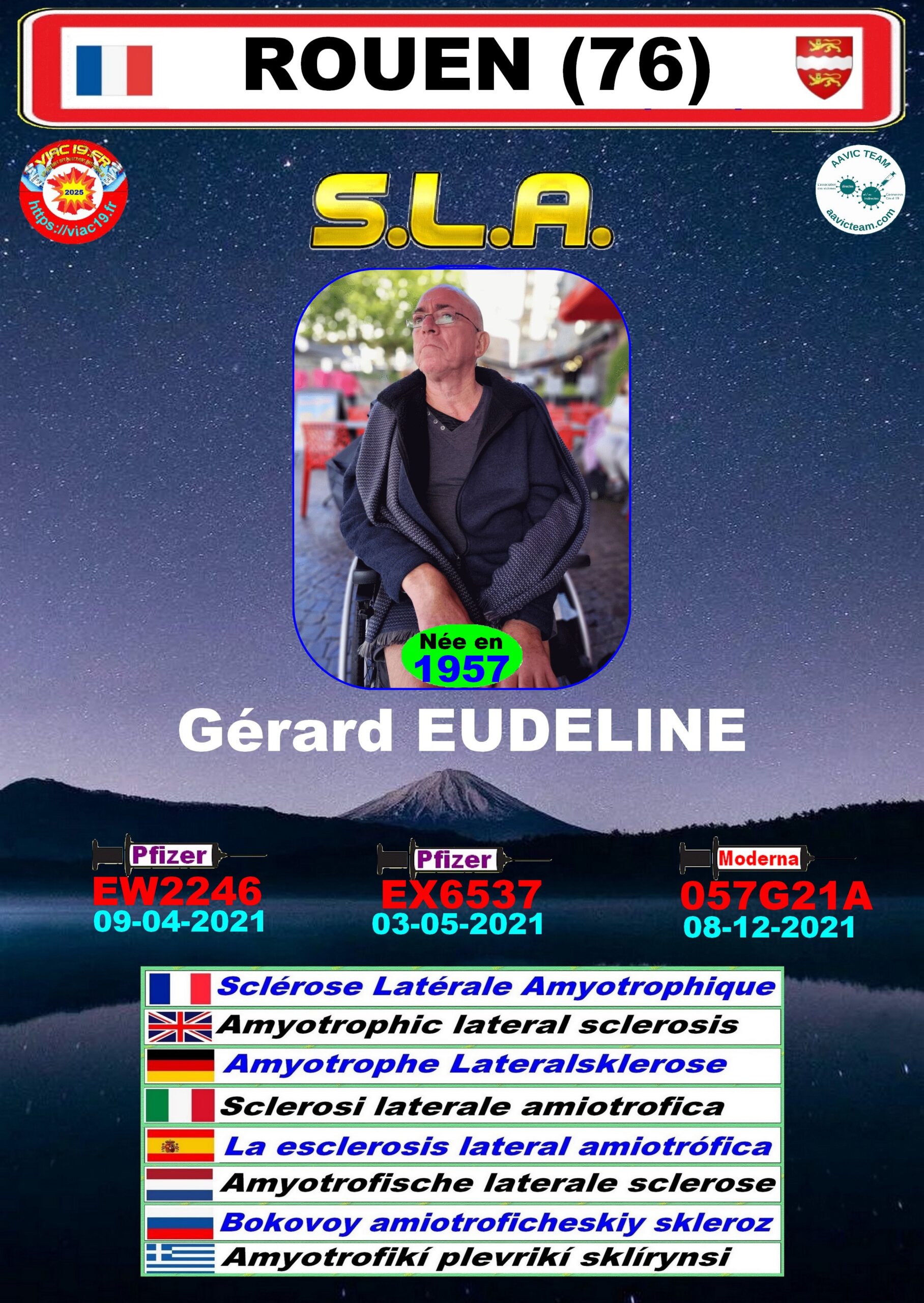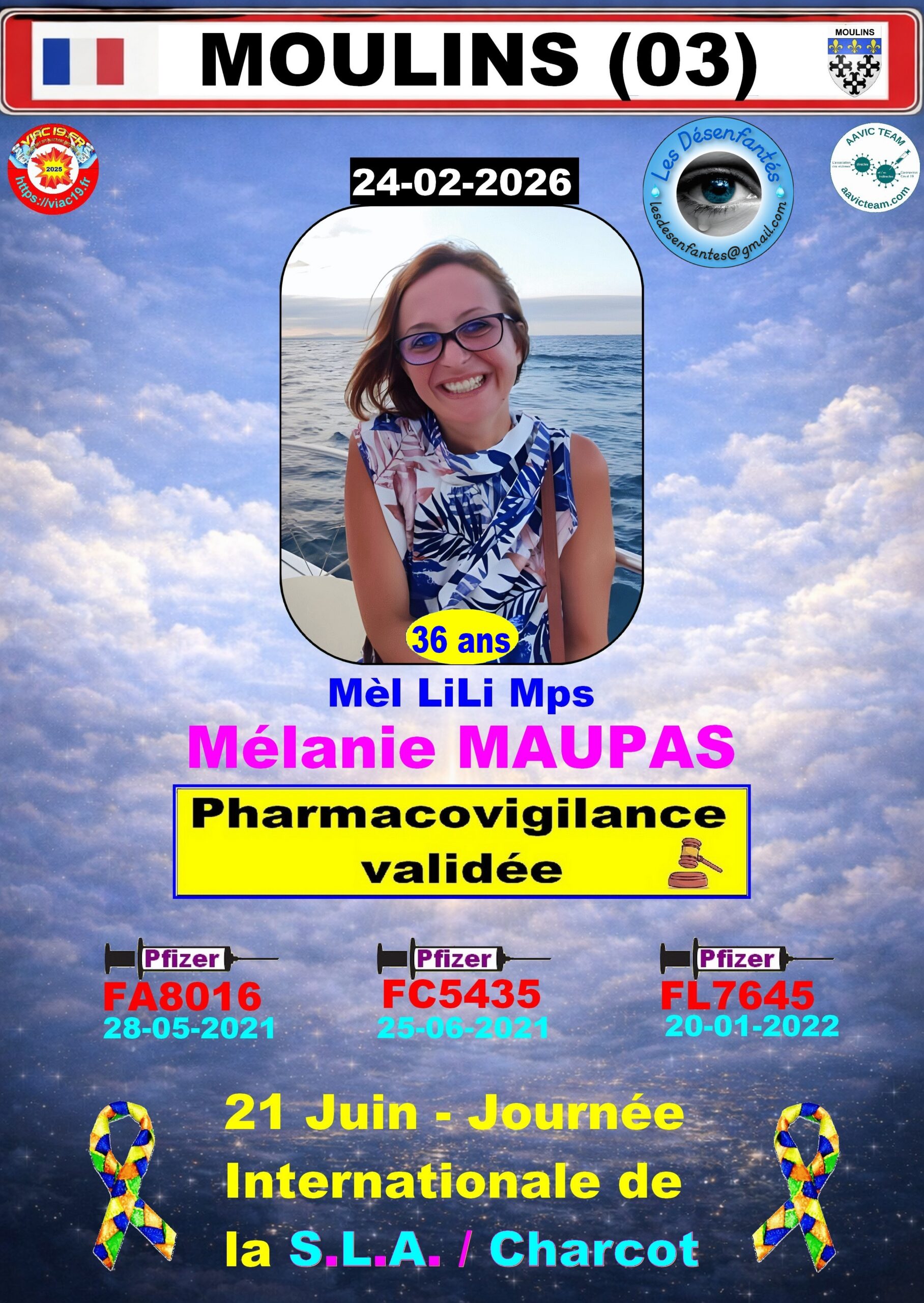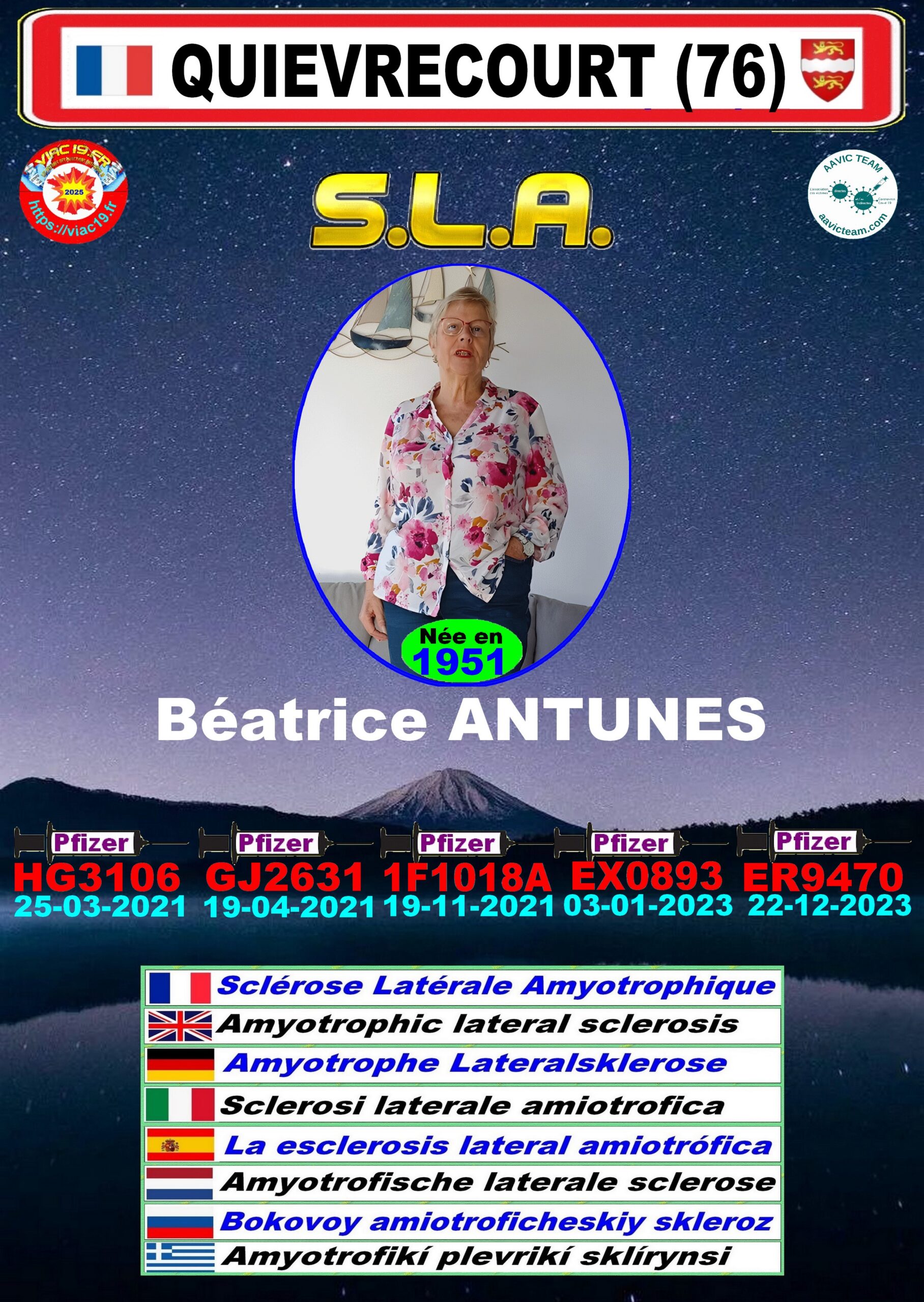 Je précise aux visiteurs, que ces victimes ne sont que celles qui ont eues le courage (victimes et familles) de témoigner sur la carte de France des victimes. Notons que statistiquement (Réf. victimes AAVIC TEAM), les cas de SLA/Charcot post vaxx sans lien génétique représentent + de 19% des effets indésirables répertoriés.