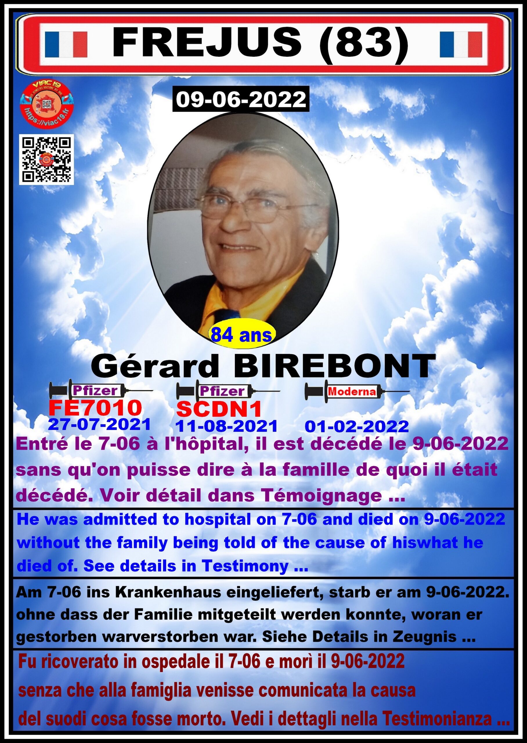 Quand j’ai demandé son dossier médical complet, je n’ai reçu qu’une simple feuille de bilan. Je n’ai jamais reçu toutes les interventions et médicaments administré. Je suis allée questionner le médecin en lui demandant de quoi est décédé mon père ? Car je ne comprenais pas l’apparition de cette tumeur, je ne comprenais pas la coagulation de son sang. J’avais fait des recherches et constaté que les symptômes dénoncés par la vaccination correspondaient aux symptômes de mon père. J’ai donc envoyé le dossier au médecin indiquant les conséquences constatés par la vaccination COVID en lui demandant si cela pouvait en être la cause. Il n’a jamais répondu malgré mes relances. Je suis allée voir les pompes funèbres en demandant si ils avaient constaté quelques choses d’étrange lors de la préparation du corps. Je n’ai jamais eu de retour….